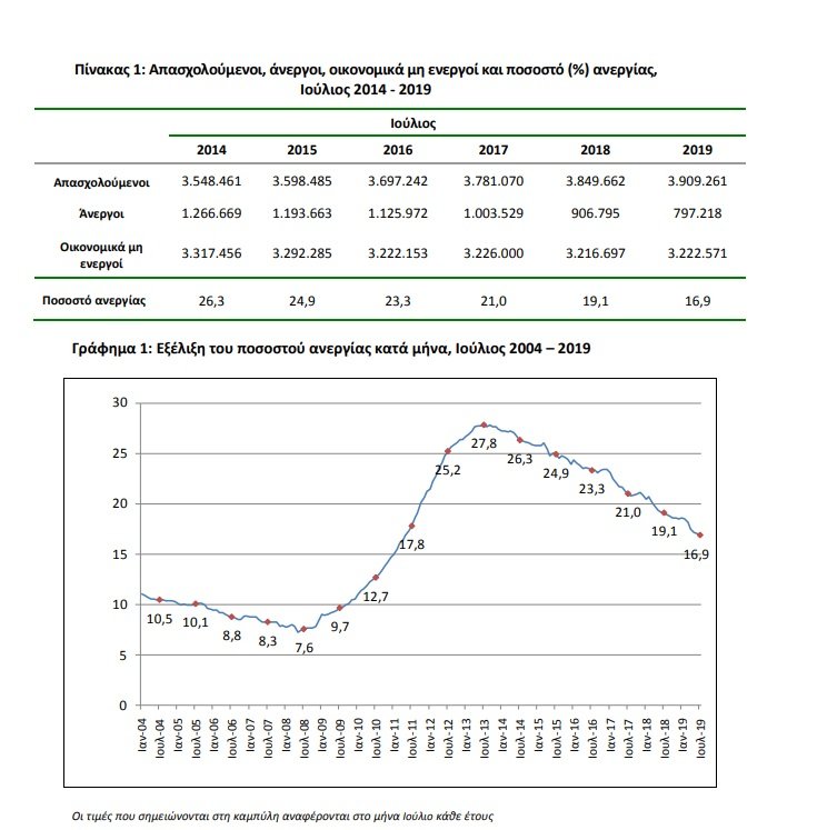 - Αναλυτικότερα: Το εποχικά διορθωμένο ποσοστό ανεργίας τον Ιούλιο του 2019 ανήλθε στο 16,9% έναντι 19,1% τον Ιούλιο του 2018 και του αναθεωρημένου προς τα άνω 17,1% τον Ιουνίου του 2019. Το σύνολο των απασχολουμένων, κατά τον Ιούλιο του 2019, εκτιμάται ότι ανήλθε σε 3.909.261 άτομα. Οι άνεργοι ανήλθαν σε 797.218 άτομα.